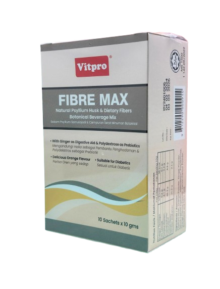 Vitpro Fibre Max is a natural psyllium husk & dietary fibers botanical beverage mix to relieve constipation and help treating diarrhea.