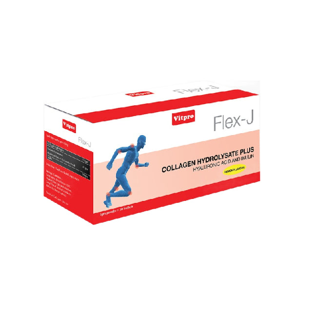 Flex-J contains Collagen Hydrolysate, Hyaluronic Acid, Lemon Juice Powder and Inulin (Frutafit IQ), which are nutritional supplements that contributes greatly to Joint Health.