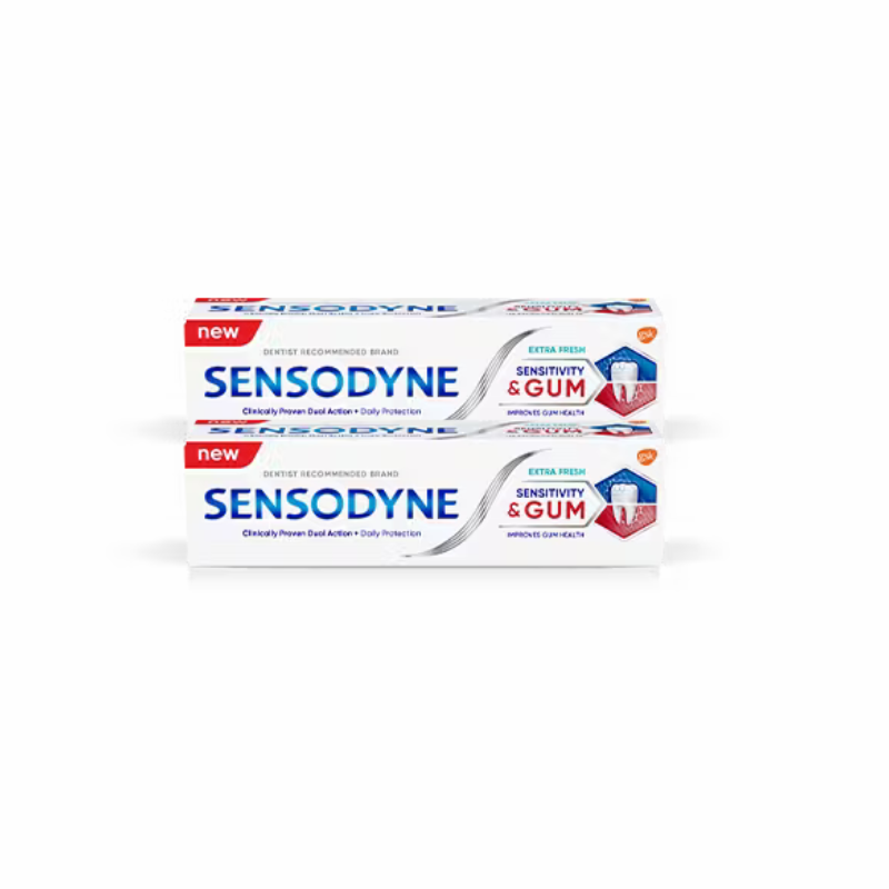 Sensodyne Sensitivity & Gum Extra Fresh toothpaste is clinically proven to relieve tooth sensitivity & improve gum health. Itโ€™s dual action formula works in two ways. It builds a protective layer over sensitive area, effectively relieving tooth sensitivity, and it targets and removes plaque bacteria to help reduce gum problems.^