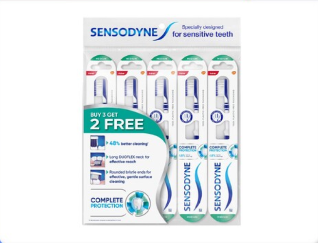 Sensodyne Complete Protection toothbrush has been specially designed with its small angled head, soft outer bristles and inner twisting bristles provide effective cleaning for enamel, gums and plaque removal. For effective cleaning of your teeth and gums we recommend twice daily brushing with Sensodyne Complete Protection toothpaste and toothbrush.