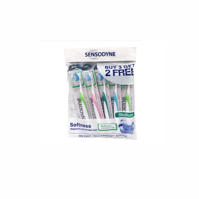 Sensodyne MultiCare Medium Toothbrush, available in a convenient pack of 5, is designed to provide effective and gentle oral care for individuals with sensitive teeth. The medium bristles offer a balanced cleaning experience, removing plaque and maintaining oral hygiene without causing discomfort to sensitive teeth and gums. The ergonomic design of the toothbrush ensures a comfortable grip and efficient cleaning. With Sensodyne's expertise in oral care, the MultiCare Medium Toothbrush is a reliable choice for those seeking a toothbrush that caters to their specific dental needs. Elevate your oral hygiene routine with Sensodyne MultiCare Medium Toothbrush for a gentle yet thorough cleaning experience.