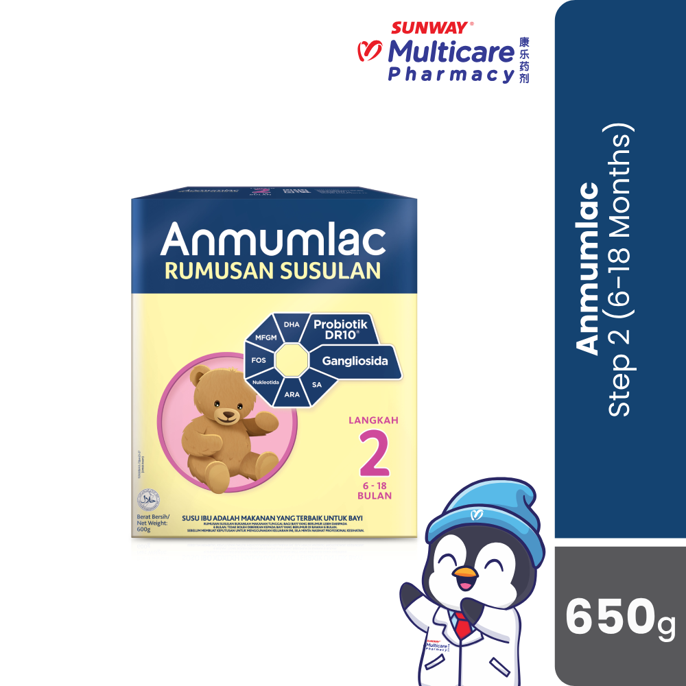 Anmumlac is a formula that contains Essential Fatty Acids (EFA: Omega-3 and Omega-6), DHA (Docosahexanoic Acid), Gangliosides and SA (Sialic Acid). SA is an important component of brain tissues. Bifidobacterium lactis (DR10)* helps to improve beneficial intestinal microflora in the gut and may help to reduce the incidence of diarrhoea. This formula also contains vitamin and minerals your baby needs for growth and development such as Nucleotides, Calcium, Zinc, Vitamins A, C, D3, Iron and Iodine.