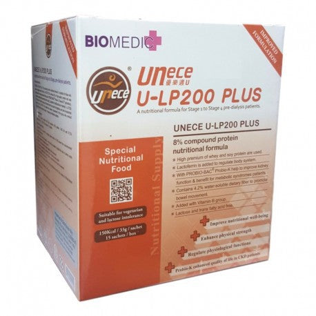 Unece U-LP200 contains 8% of compound protein with addition of synprobiotics (ABF three probiotic bacteria and soluble dietary fibers), which can improve intestinal microflora, digestive function and increase strengths. This product is highly recommended for individuals who have a protein intake limitation. Unece U-LP200 provides a balanced nutritional supplementation for this group of individuals.