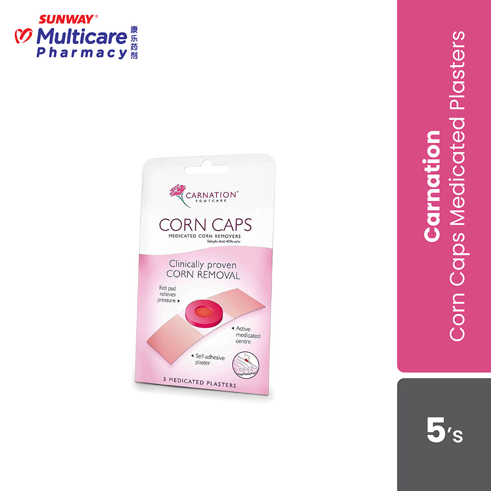 Carnation Corn Caps are clinically proven to remove corns within a 10 day treatment period . Combine a measured dose of Salicylic Acid Ointment wth a soft felt corn ring to relieve pressure whilst the corn is treated. Salicylic Acid loosens the intracellular cement holding hardened skin together allowing it to flake away, softening and loosening the nucleus to allow clean removal.