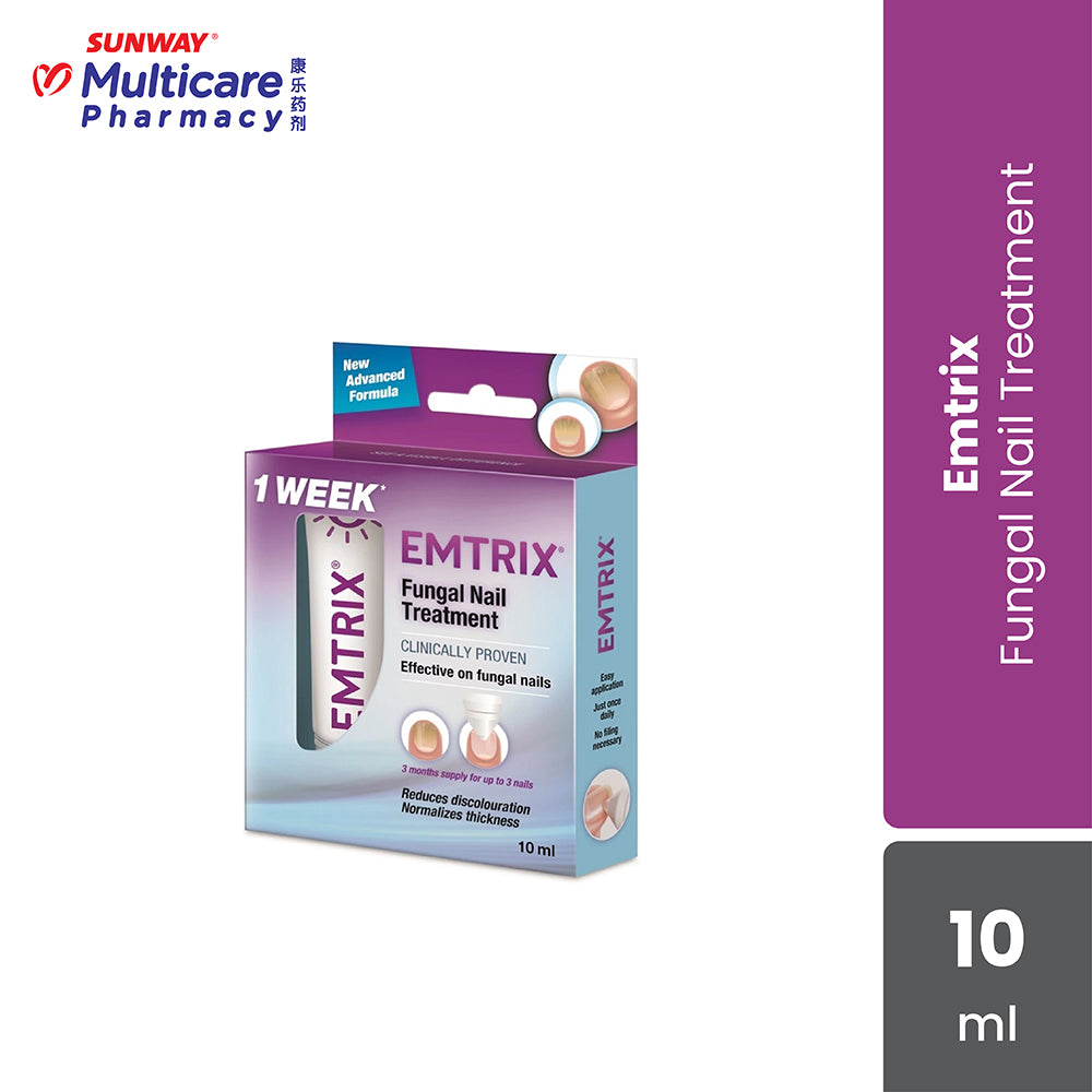 Emtrix, clinically proven topical solution for fungal nail treatment. First visible results may be seen in as early as 2-4 weeks*. Easy to use, Apply once daily. No scaping and filing is required.