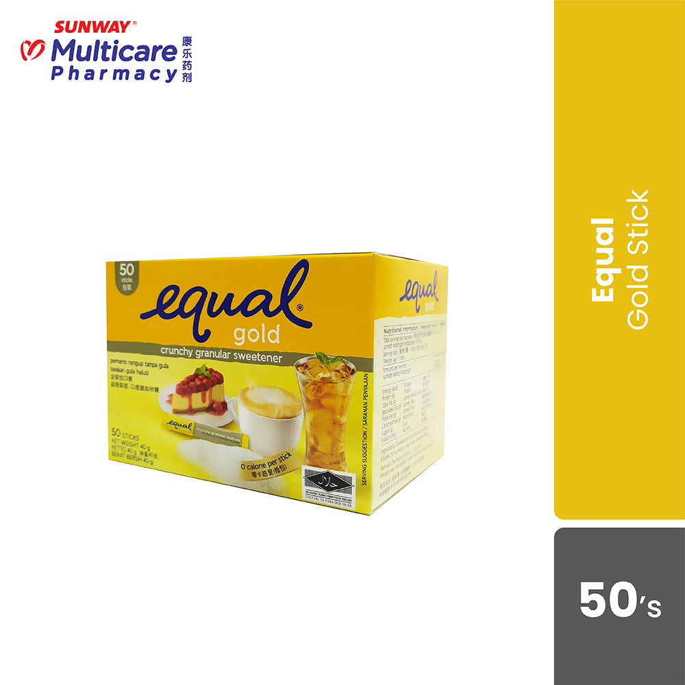 1 x EQUAL Gold Sticks 50 sachets Equal Gold with a unique crunchy texture is a great tasting sugar free sweetener, replacement for sugar. Suitable for those who wants to control weight, sugar level or diabetics. Using one stick to replace two teaspoon of sugar in hot and cold drink, smoothies, in cooking and baking or sprinkling on fruit and cereals, enjoy that delicious sweet taste with the texture of sugar, but without the calorie. Product Details Direction for Use 1 stick equal to 2 level teaspoons of sugar