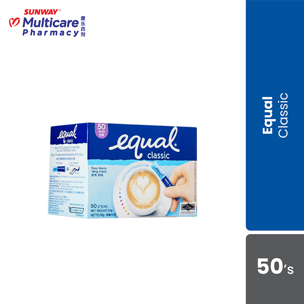 What is in the box: 1 x EQUAL Sachets 50 sticks Equal Sachets are a great alternative for sweetening your tea or coffee. You can also sprinkle it on fruit or your cereal in the morning! 1 Equal Pillow Sachet (4 Cal) = 2 level teaspoons of sugar (32 Cal) Product Details 1. Handy packs of Equal in a powder form make great single serving table top sweeteners 2. Use Equal to sweeten foods like beverages, fruit cocktails, cereals and yogurt 3. 3 years shelf life Ingredients Lactose (Milk product), Artificial Sweetening Substance (Aspartame 36mg), Anti-Caking Agent (Silicon Dioxide). Caution Unsuitable for Phenylketonurics. Applicable Return Policy (Description) Please refer to the Return Policy for further information.