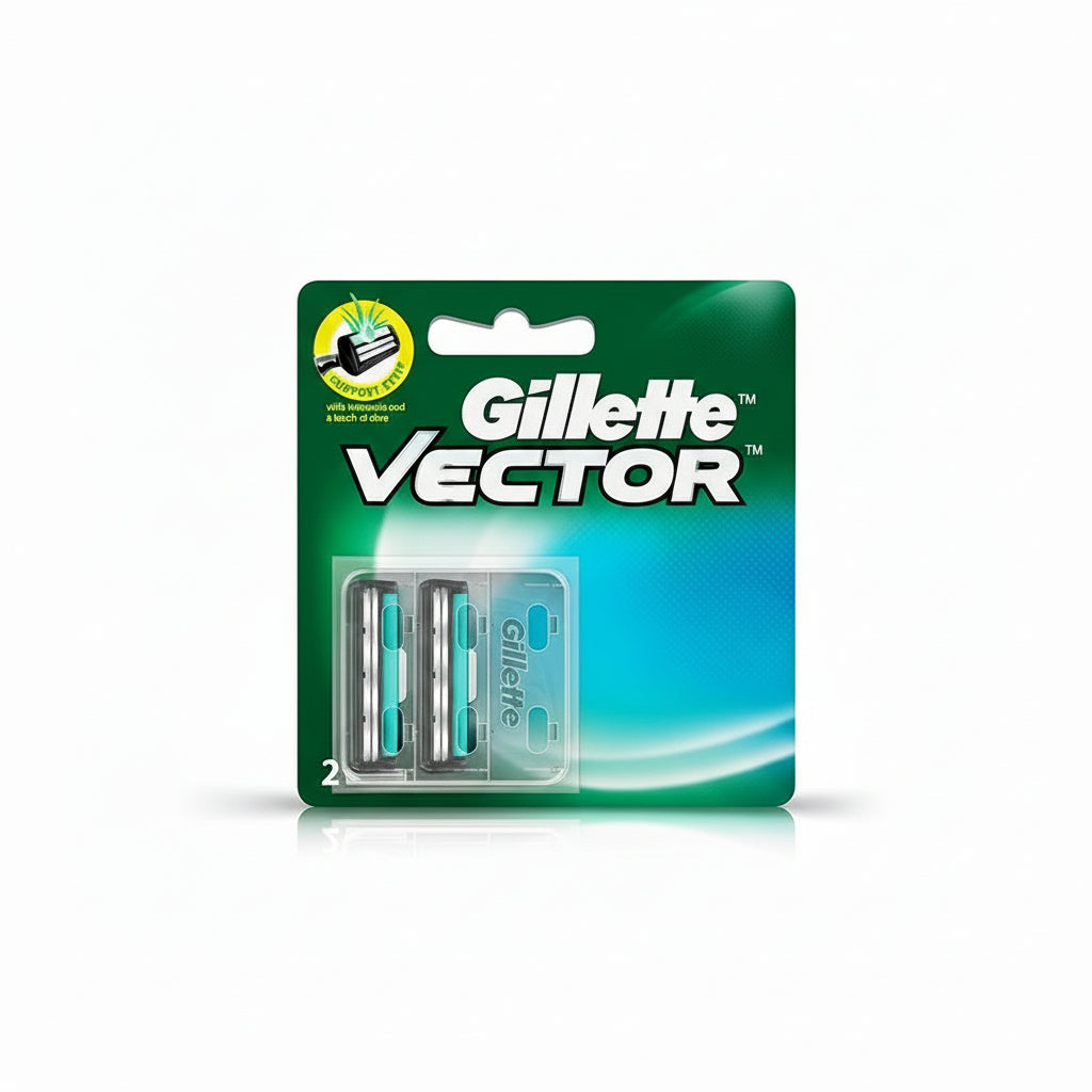 Gillette Vector Plus Chart 2s : Gillette Vector Razor fast Twin blades shave you twice with each stroke eliminating irritating repeat strokes for a faster shave than with a double edge blade to give you a close shave and reduce the probability to nick. Comfort strip with lubricants and a touch of aloe gives a more comfortable shave. Hair and debris are removed in 1 easy push of the button. Comfortable - The lubricating strip activates when wet . reducing pulling and skin irritation for a smoother more comfortable shave. The pivoting head automatically adjusts to the curves of your face to give you a safe shave.