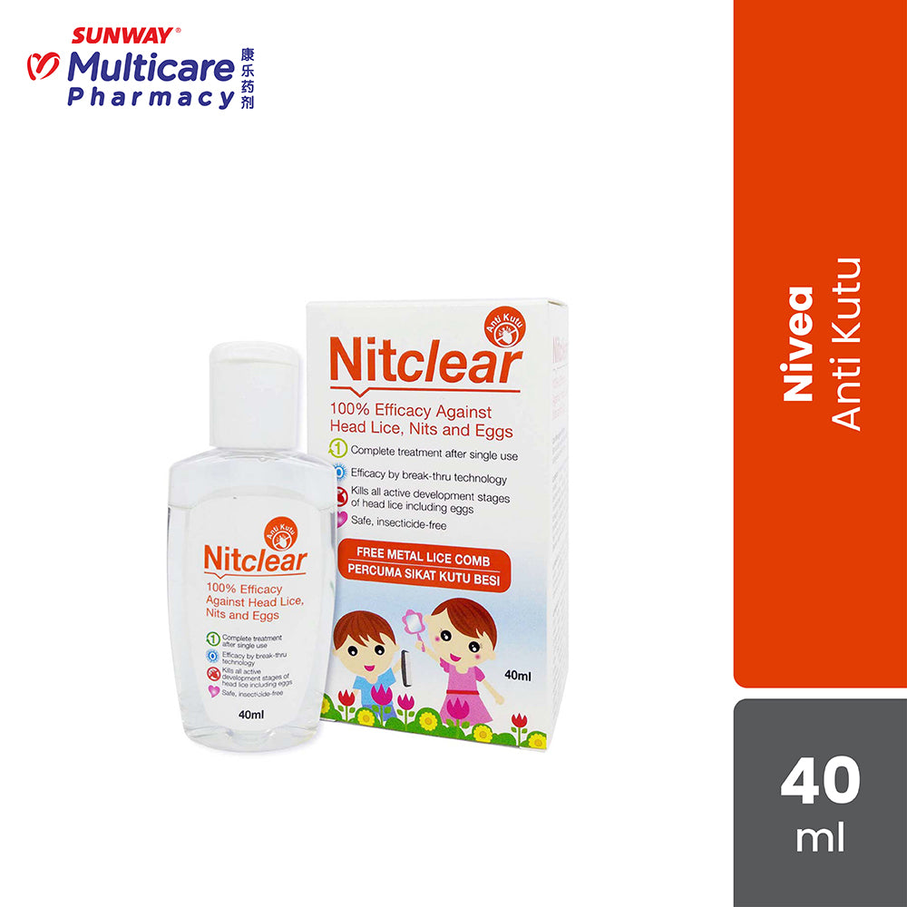 Break-thru technology ensures quick and even spreading on the scalp and hair, kills all departmental stages of head lice. Nitclear is non-toxic, free from pesticides, perfurmes, dyes and harsh chemicals. It is hypoallergenic, suitable for all age groups and may be used often as needed.