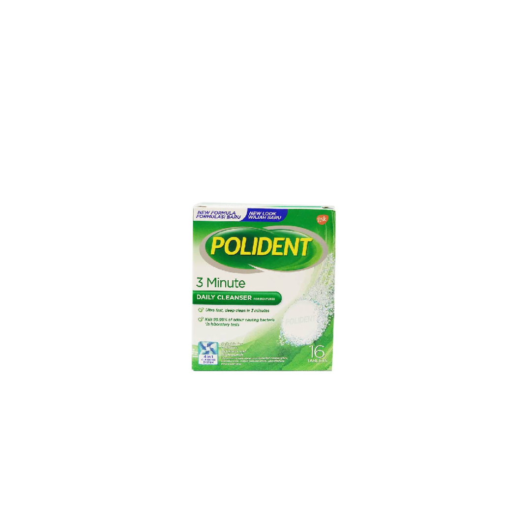 Polident Express 3 minute for a fresher clean. Remove stains in just 3 minutes. Anti-bacterial cleaning system. Remove odour-causing bacteria. Leaves dentures minty fresh. Restores natural whiteness of dentures. More effervescent action. Cleans where a toothbush can miss. Use Polident Complete Comfort Denture Adhesive Cream to help make you more comfortable with your dentures.