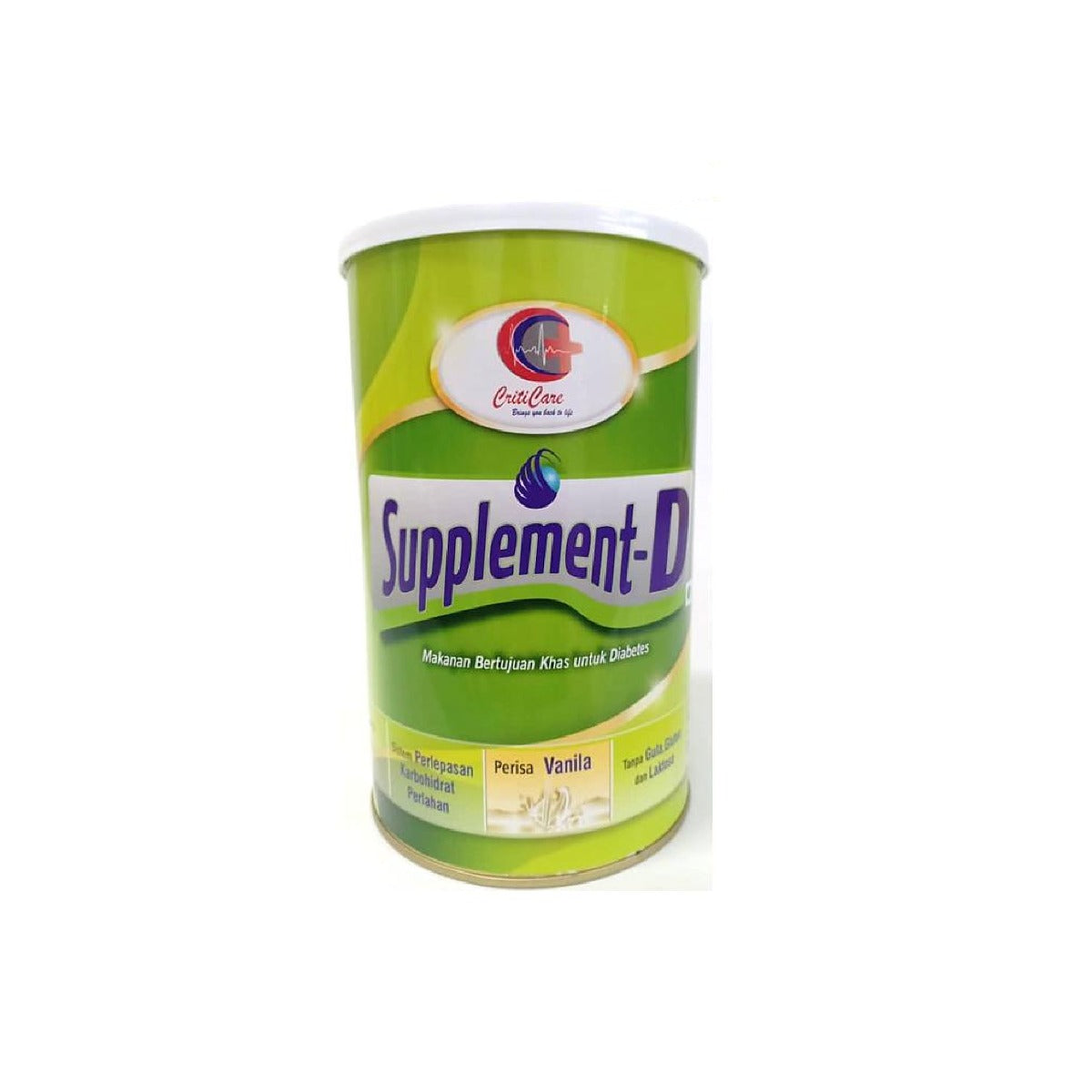 - Supplement D is a specialised nutrition supplement for a good glycemic control in diabetics with or without complications. Supplement D is a calorie dense formula with a unique slow release carbohydrate system for enhanced glycemic control. The formulation is based on the recommendations of the American Diabetic Association guidelines - 70% of the energy coming from MUFA and Carbohydrates and 20% from proteins and the remaining 10% from poly unsaturated fats. Ingredients: Maltodextrin, Whey Protein Concentrate, Soya Protein Isolate, Oleic Sunflower Oil, Maltitol, Fructo Oligosaccharides, Resistant starch, Taurine, Carnitine, Inositol, Sucralose, Vitamins, Minerals and contains added flavour.