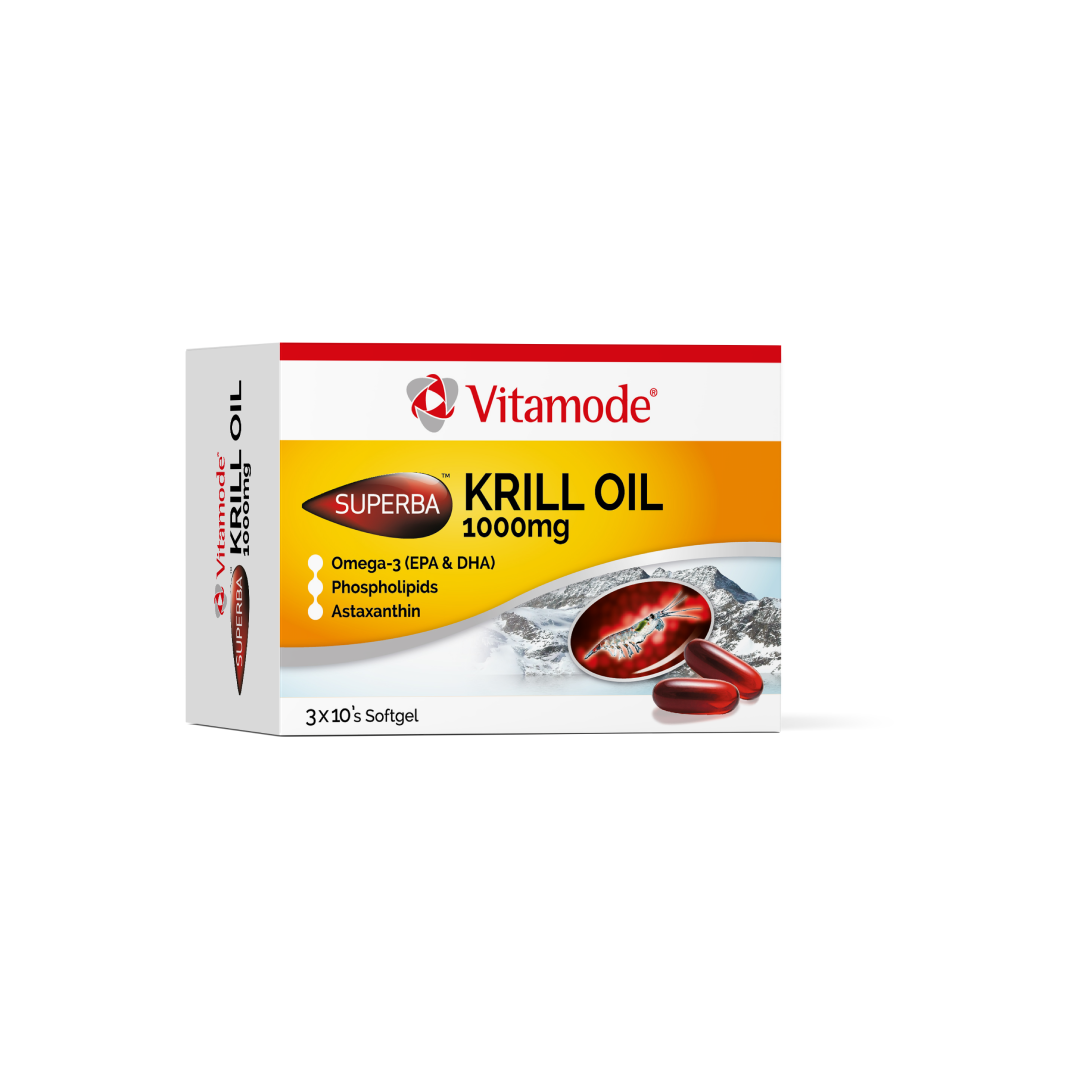 Vitamode Krill Oil 1000mg Softgel offers natural source of Omega-3 (EPA & DHA) that is bound to phospholipids to support general well-being.