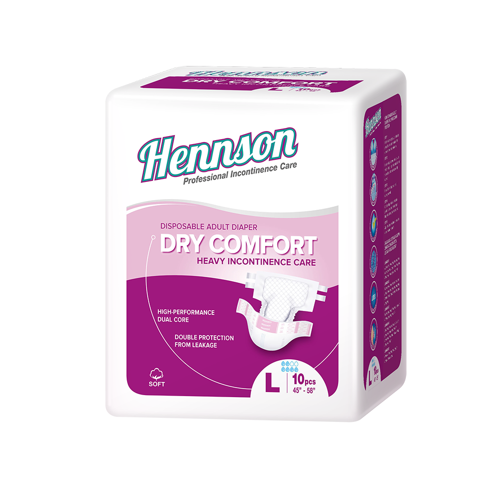 Hennson Disposable Adult Diaper is made from Super Absorbent Polymer and tree pulp that provide superior absorbency and protection against incontinence. With its Ultra absorbent and odor control features, it give comfort to users, prevent rashes and infection on users' skin. It is cost effective for long term usage as as result of fewer changes needed. Hennson Disposable Adult Diaper has discreet design with wide coverage and latex free.