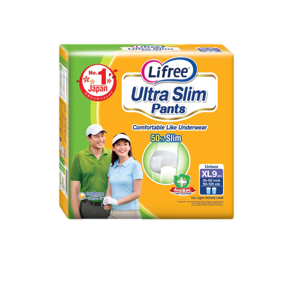 LIFREE Ultra Slim adult pants XL is designed for waist 90cm - 125cm / 35" - 50". 2 cups absorbency level. Comfortable and discreet like an underwear with the low waist cut and being 50% slimmer, this is suitable for day use, light use and for travelling. The flexible leg cuffs reduces friction and prevents side leakage, and the odour control polymer minimizes unpleasant odour.