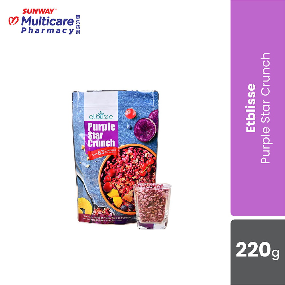Crispy and sweet with clusters of Australian whole grains and a punch of fresh dried fruits, Etblisse Purple Star Granola Crunch will satisfy your hunger with wholesome goodness at any time of the day. Enhanced with premium Taiwanese purple sweet potatoes, this hearty combo will give your body sustained energy and anthocyanin antioxidants boost to strive through your daily adventure!