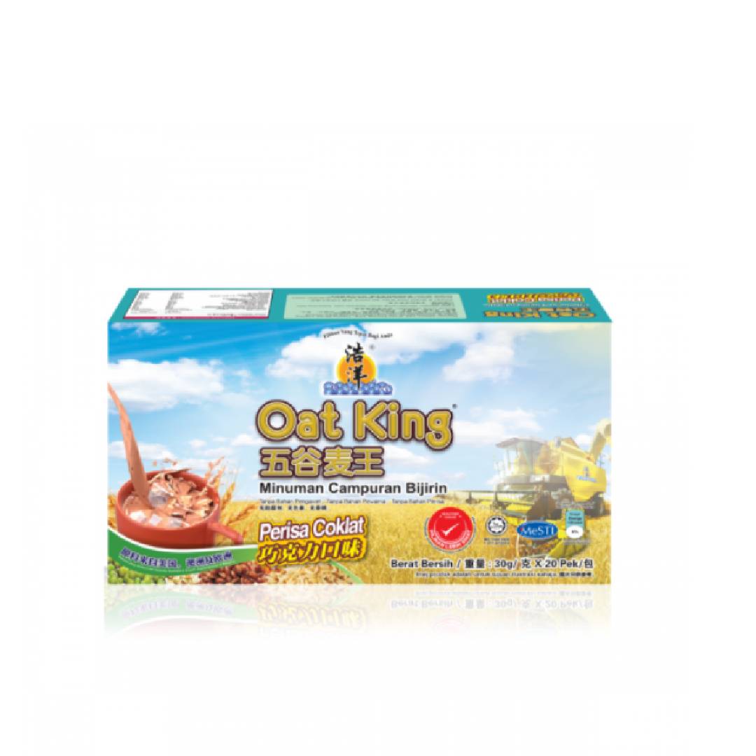 - Oat King (Chocolate Flavour) is produced using high quality of oats, barley, wheat, wheat germ, wheat bran, brown rice, red rice, millet, corn, black bean, soybean, mung bean, white navy bean, sesame seed job's tear, cocoa powder, chocolate malt originated from America, Australia and Europe.