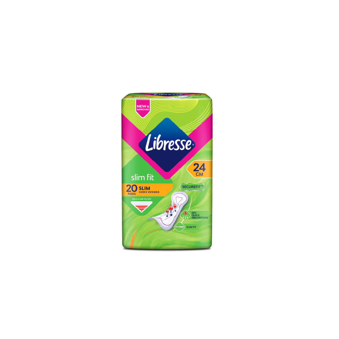 NEW & IMPROVED Libresse® Slim Non Wing 24cm pad is made with our patented technology SecureFit™ - wider front, narrower middle and split rear back to comfortably hug your unique curves; Deep Flow Channels (DFC) that delivers all round protection and better absorption.