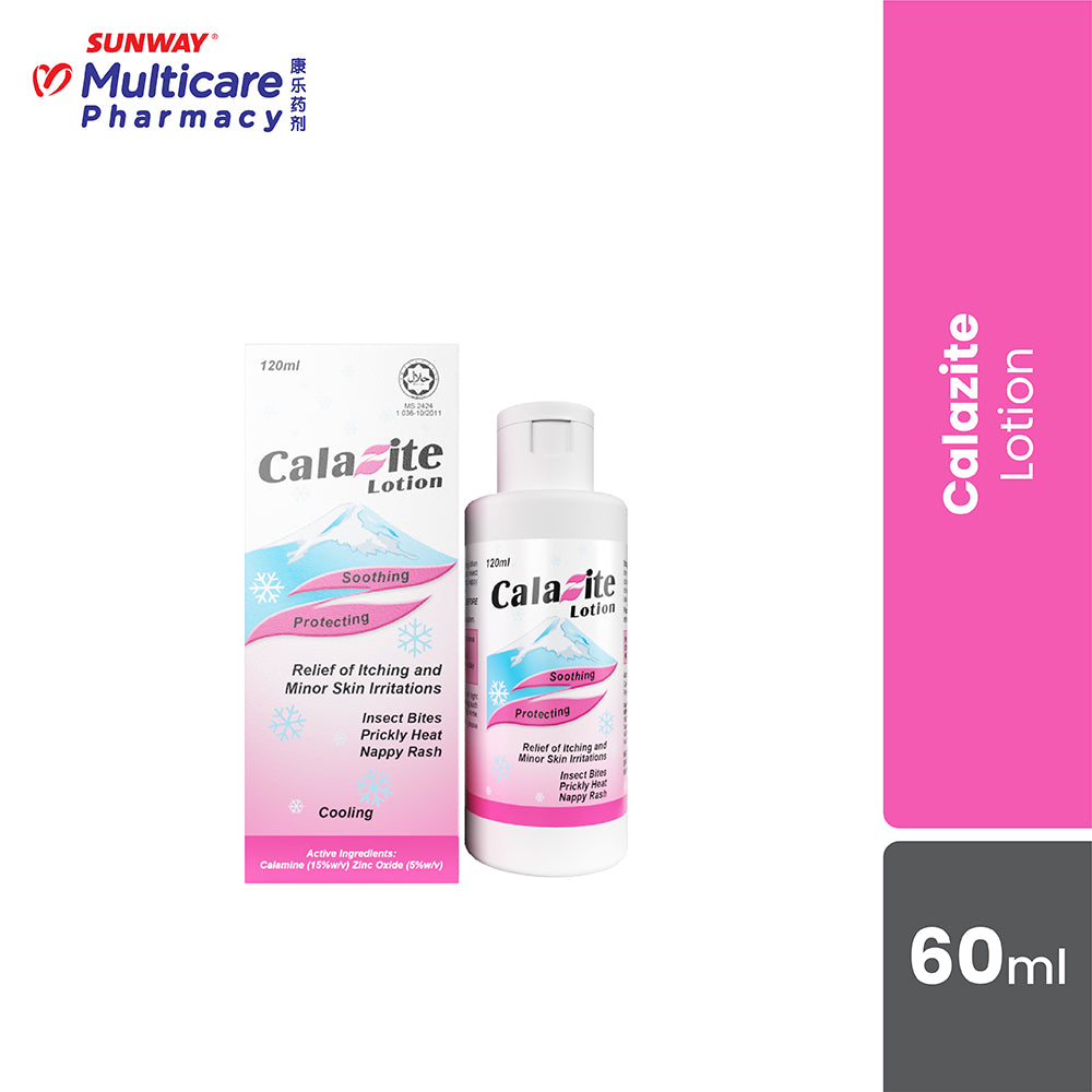 Calazite Lotion is a soothing and protective lotion for the relief of itching and discomfort due to minor skin irritations such as insect bites, prickly heat, allergic rash, sunburn, nappy rash and other skin irritations.