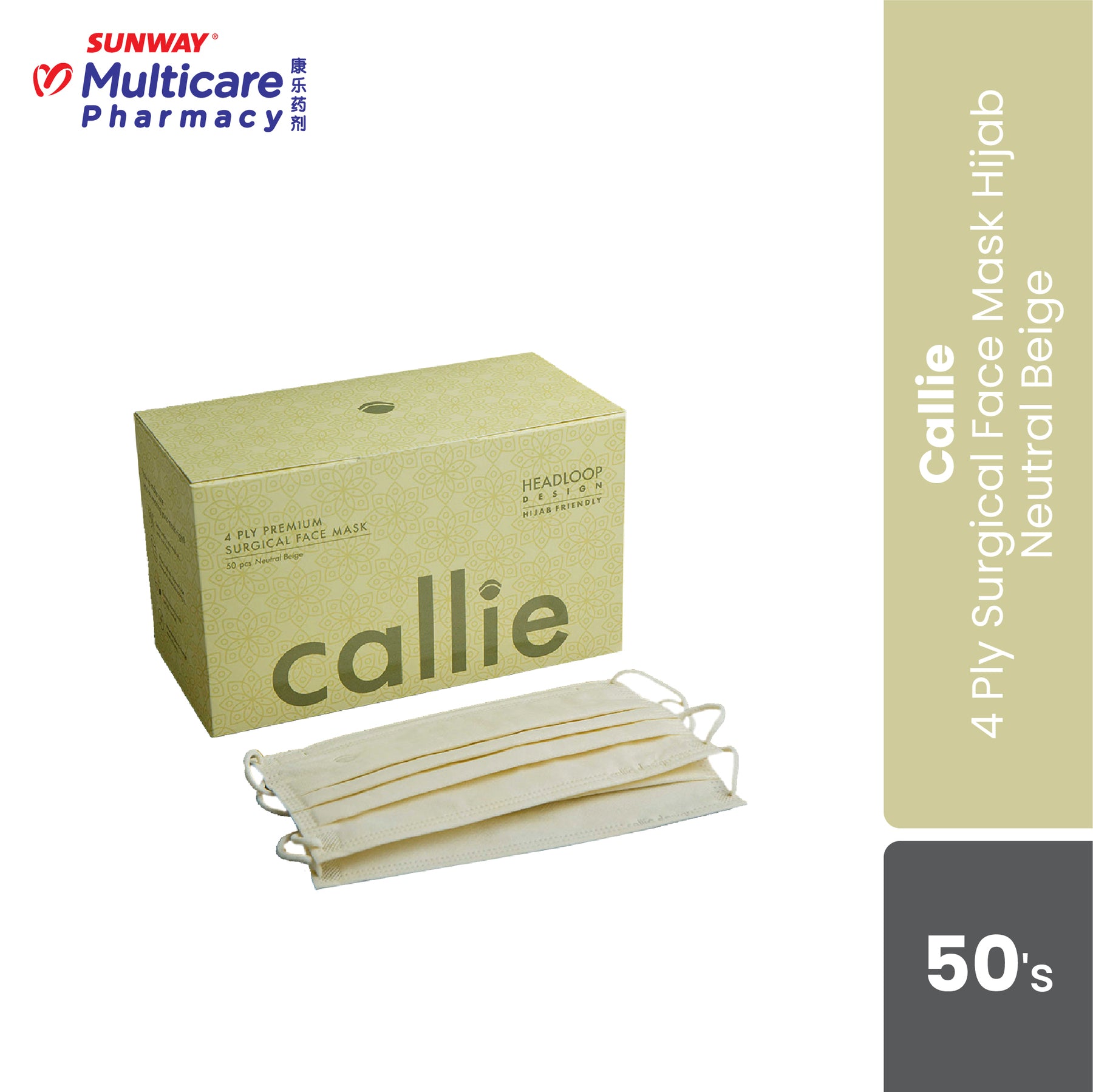 Set the stage with Beige while being #fashionablysafe! 50 pcs of 4-ply surgical grade mask with up to 99% submicron protection Headloop design, Hijab friendly Comfortable, highly-breathable design