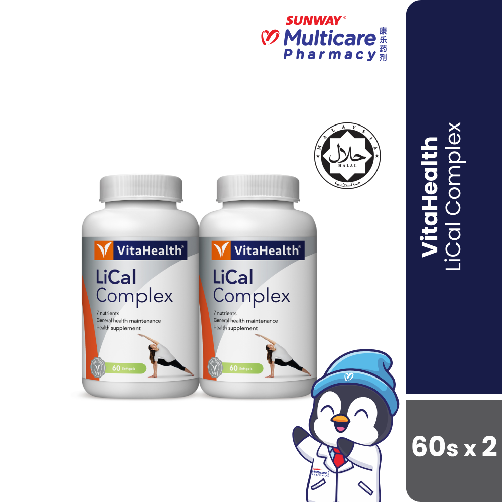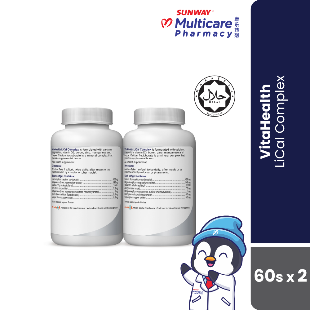 VitaHealth LiCal Complex is a comprehensive liquid-calcium formula combining a selection of key bone-building nutrients to build strong and dense bones. It is enriched with vitamin D3, magnesium for efficient absorption and utilization of calcium. It features FruiteX-B® calcium fructoborate, a plant-based calcium-boron mineral complex, which provides highly bioavailable boron to preserve the essential store of calcium and magnesium as well as to increase serum vitamin D levels in the body. A daily serving of 2 softgels provides 800mg elemental calcium to meet the daily calcium needs for adults. It helps prevent osteoporosis and reduce the risk of falls and fractures in later life.