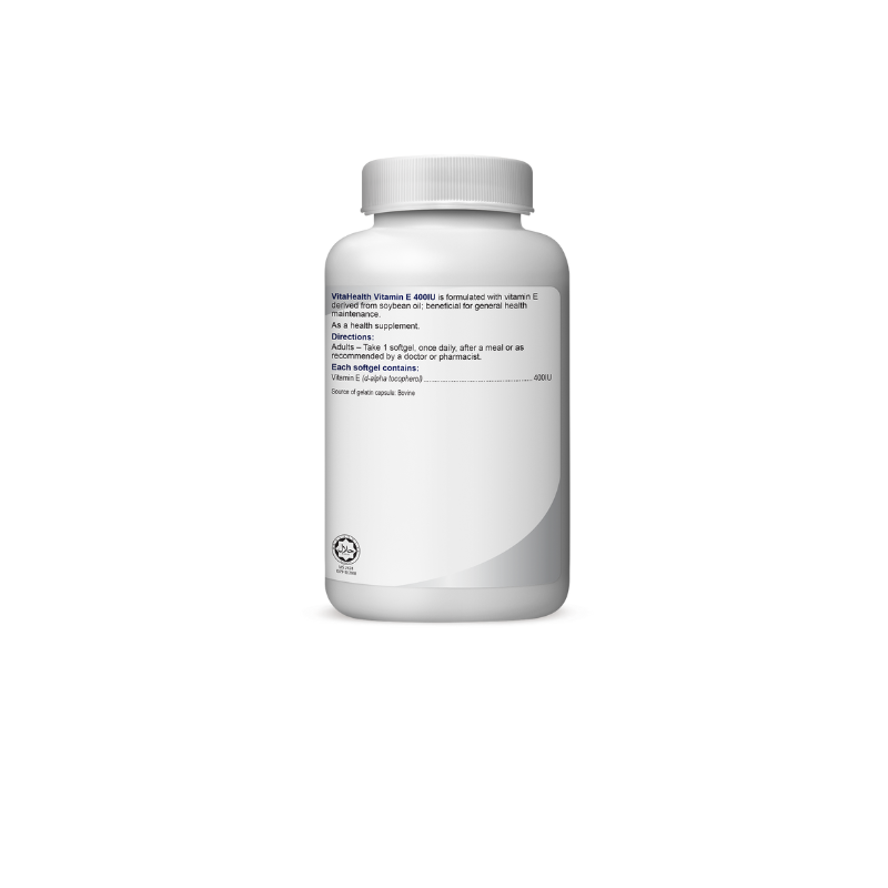 VitaHealth Vitamin E 400IUย provides a natural source of vitamin E (d-alpha tocopherol) derived from soybean oil.