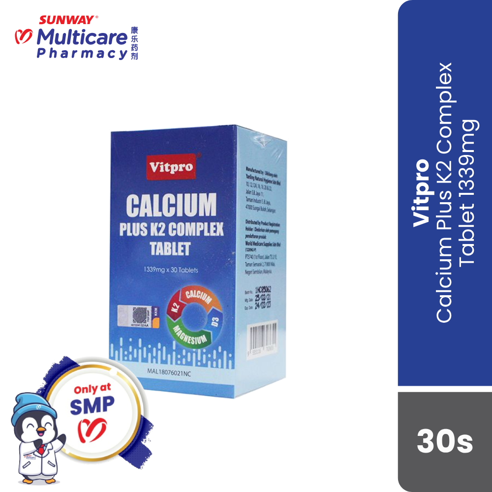 Vitpro Calcium Plus K2 Complex Tablet contains important vitamins & minerals for bone health : Vitamin K2, Vitamin D3, Magnesium, and Calcium. These four have a synergistic interplay between them, which lead to a proper synthesis of calcium for human bone and other parts of the human body.