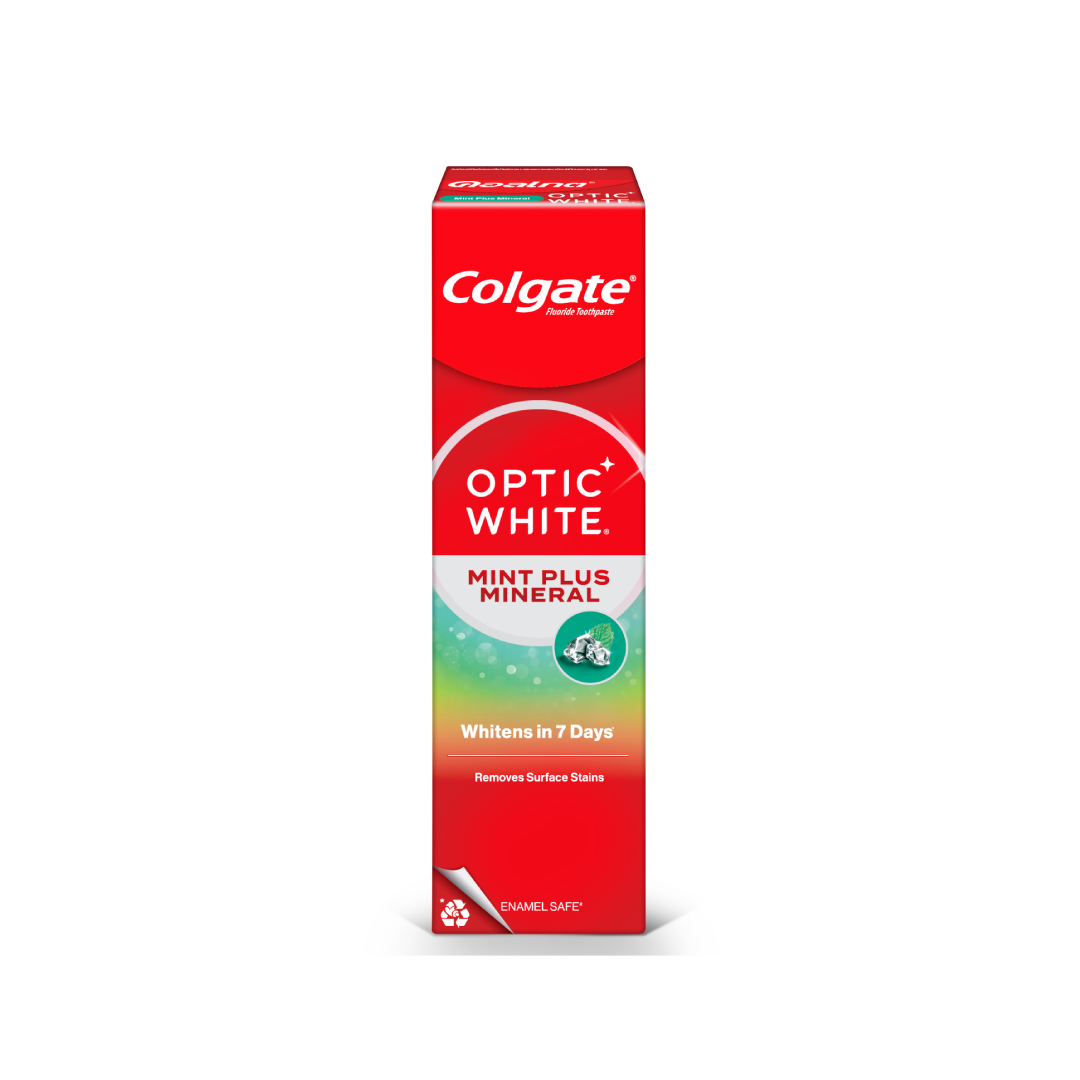Get whiter teeth in 7 days* with Colgate Optic White® Mint Plus Mineral Whitening Toothpaste. With whitening micro mint plus minerals that help remove stains from teeth surface for a radiant smile*. It thoroughly cleans and safely whitens your teeth surface* while providing anticavity protection. Now in a new look!
