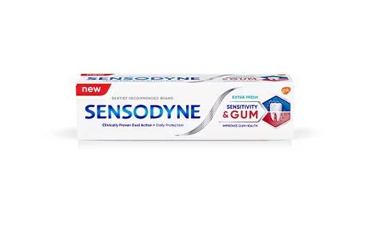 Sensodyne Sensitivity & Gum Extra Fresh toothpaste is clinically proven to relieve tooth sensitivity & improve gum health. Itโs dual action formula works in two ways. It builds a protective layer over sensitive area, effectively relieving tooth sensitivity, and it targets and removes plaque bacteria to help reduce gum problems.^