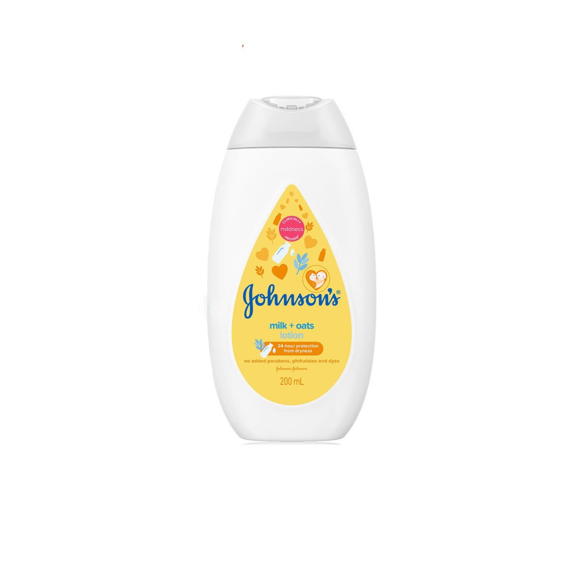 Johnson's ® Milk + Oats lotion with natural milk and oat extracts to help restore dry skin, 24-hour protection from dryness.