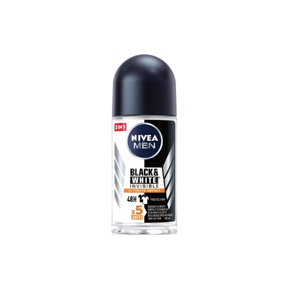 NIVEA MEN Black & White Ultimate Impact Deodorant with 5 in 1 protection of anti-sweat, anti-stain, anti-odor, anti-residues and anti-irritation that provides long lasting protection with a pleasant skin feel and all day freshness. With white mark protection on black clothing & anti-yellow staining on white clothing. Reliable 48h anti-perspirant protection that cares for your skin