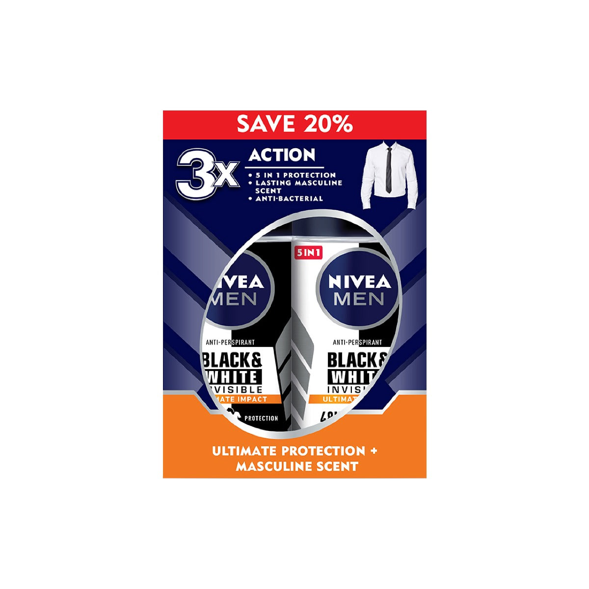 NIVEA MEN Black & White Ultimate Impact Deodorant with 5 in 1 protection of anti-sweat, anti-stain, anti-odor, anti-residues and anti-irritation that provides long lasting protection with a pleasant skin feel and all day freshness. With white mark protection on black clothing & anti-yellow staining on white clothing. Reliable 48h anti-perspirant protection that cares for your skin