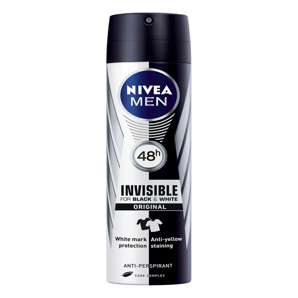 NIVEA MEN Invisible For Black & White Deodorant prevents deo stains on your skin and clothes. It prevents the build up of yellow stains on white clothes with its anti-yellow stain compound that protects cloth fibers before stain components can penetrate them, keeping them white for longer. Also with Anti-White Mark Technology that makes the white residue invisible, it keeps your dark clothes and your skin deo stain-free. World's No.1 Anti-stain Deo: NIVEA MEN INVISIBLE FOR BLACK & WHITE DEODORANT SPRAY.