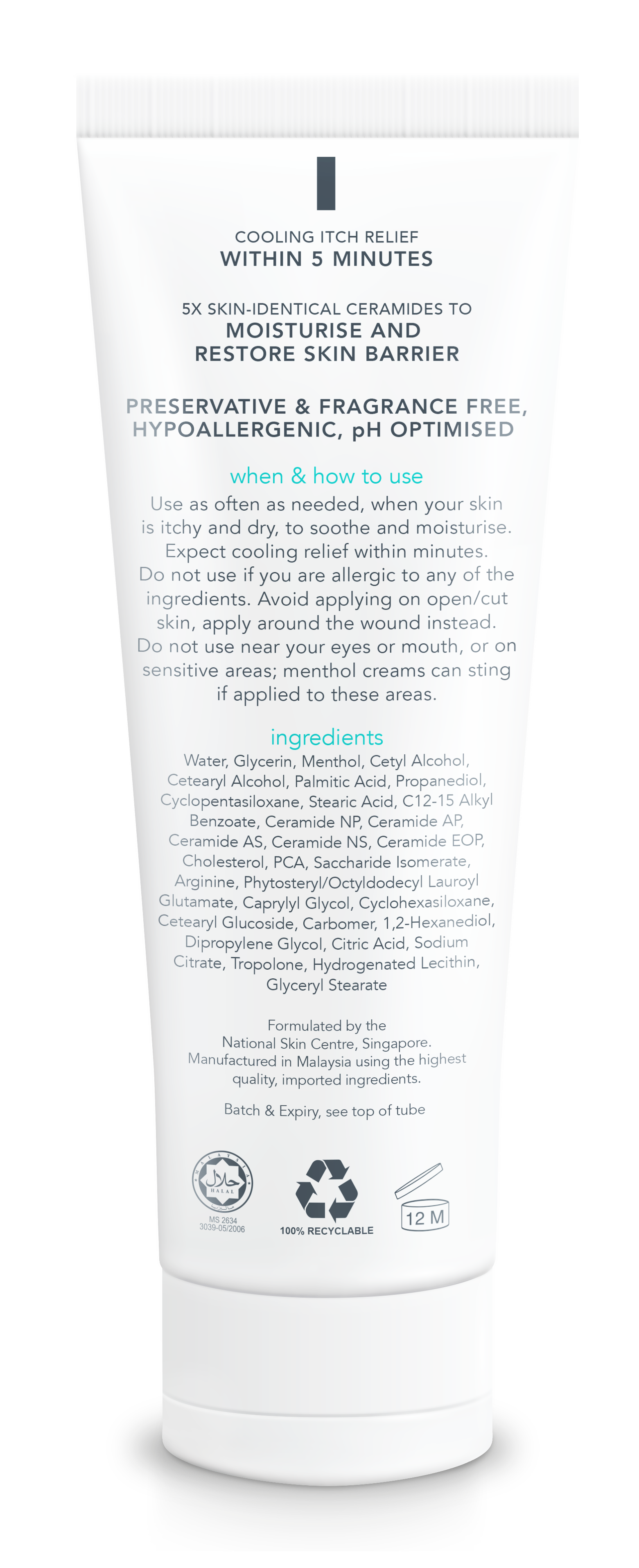 Menthol for fast, cooling itch relief and Ceramides to restore skin moisture.