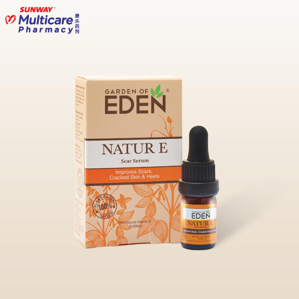 Garden of EDEN Natur E Scar Serum is a 100% natural plant based face serum to lighten all types of scars such as acne scars, burn scars, surgical scars, and also recommend for sunburn, cracked heels or lips. Dermatologically tested for sensitive skin. Suitable for children and adults