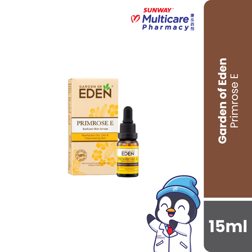 Garden of EDEN Primrose E Radiant Skin Serum is a 100% natural plant based face serum to rejuvenate dull skin and to infuse deep hydration and moisture to dry skin. Dermatologically tested for sensitive skin