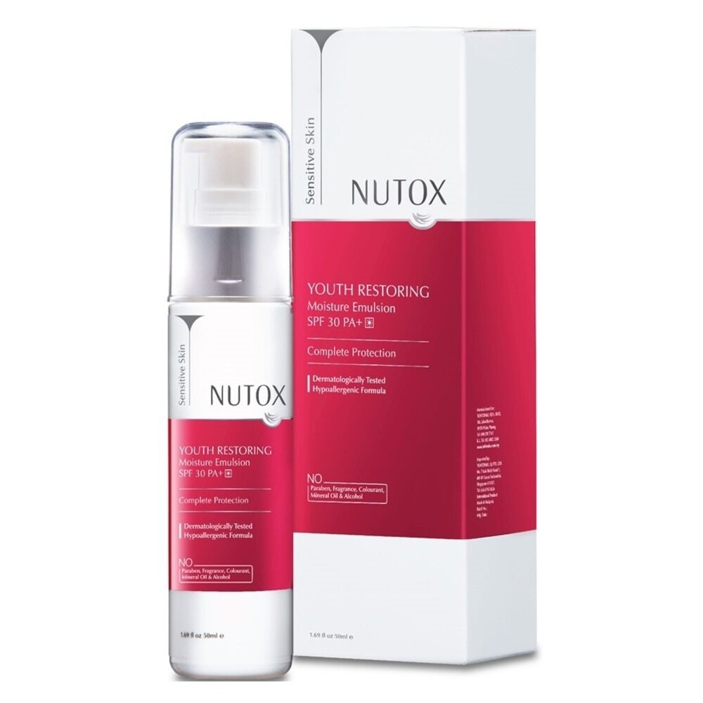 The lightweight Nutox Youth Restoring Moisture Emulsion delivers all day moisture and refines skin texture to reduce visible fine lines. This silky smooth moisturiser contains encapsulated organic UV filter to improve appearance of UV damaged skin. It is gentle, even on skin that is normally sensitive to chemical sunscreen.