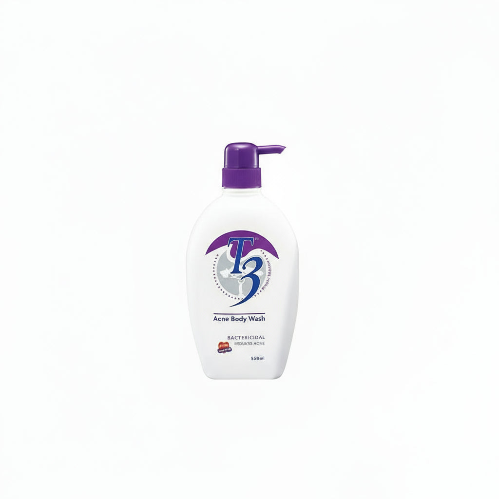 T3 ACNE BODY WASH BACTERICIDAL 550ML. T3 Acne Body Wash is an acne body wash that helps in reducing body acne. It is formulated with a bactericidal agent, that is effective in fighting against pimple-causing bacteria. It also contains natural Tea Tree Oil.