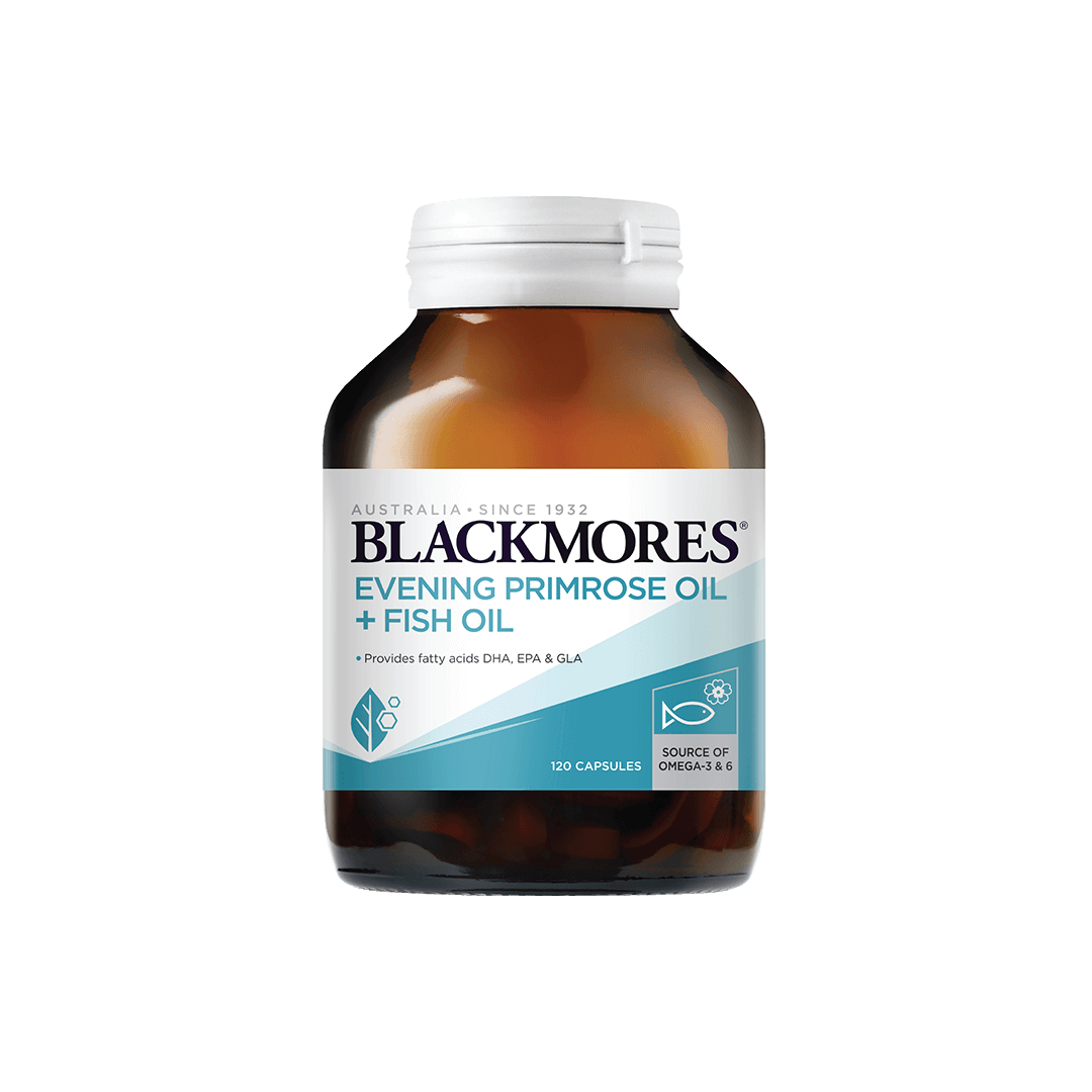 Blackmores Evening Primrose Oil + Fish Oil contains omega-3 and omega-6 essential fatty acids, which are important for the structure and function of cell membranes and growth of skin and hair. Halal certified.