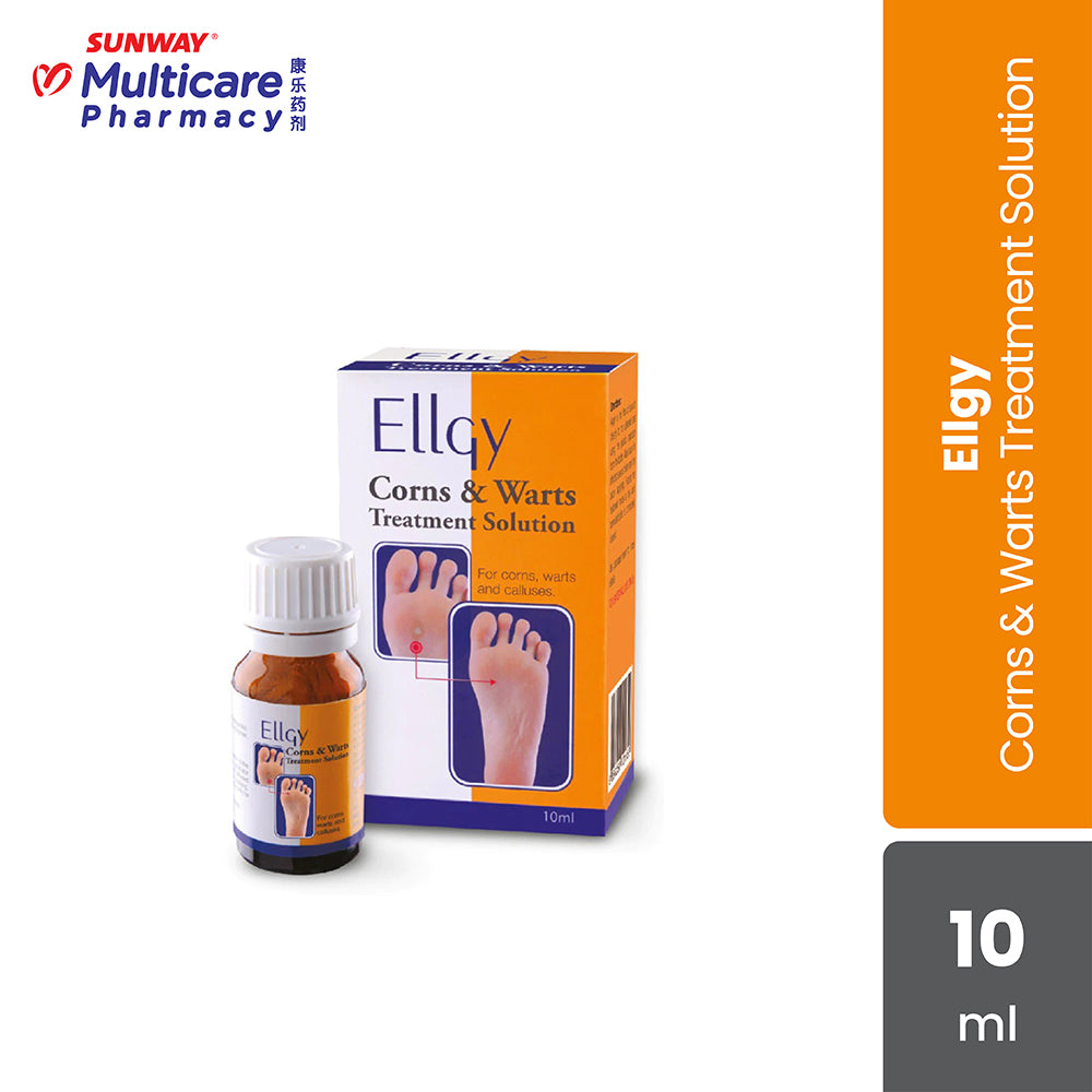 ELLGY Corns & Warts Treatment Solution contains Salicylic Acid 17% w/v to remove skin cells that are affected by corn/wart/callus.