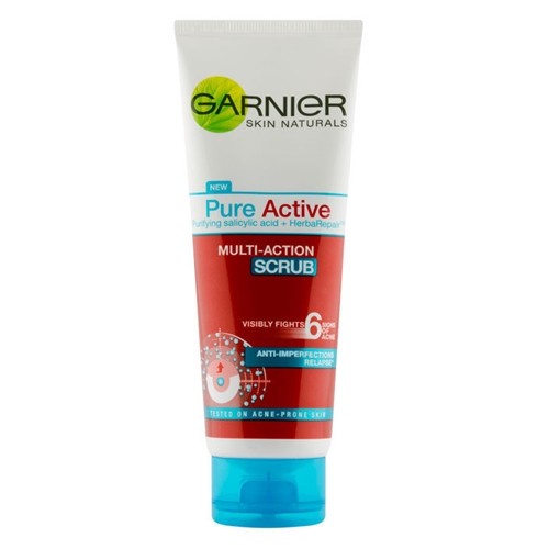Fight 6 signs of acne with Garnier's Pure Active scrub! What are they? Oily skin, pimples, whiteheads, dirt, enlarged pores and irregular texture. This scrub has gentle micro-beads for exfoliation and contains salicylic acid, an efficient anti-bacterial active combined with regenerating HerbaRepair(TM) from blueberry extract to visibly fight 6 signs of acne day after day.
