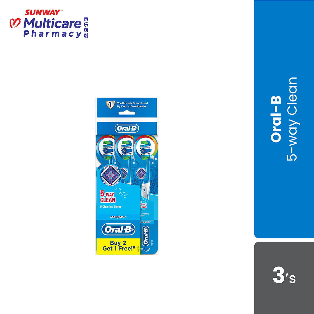 The Oral-B Complete 5-Way Clean toothbrush has 5 cleaning zones and a 2.5X deeper reach. Each cleaning zone provides a distinct cleaning benefit including hard to reach areas, in-between teeth, whitening, along the gumline, and on the tongue and cheek. The toothbrush gives users a comfortable whole mouth clean experience and is easy and effortless to use.
