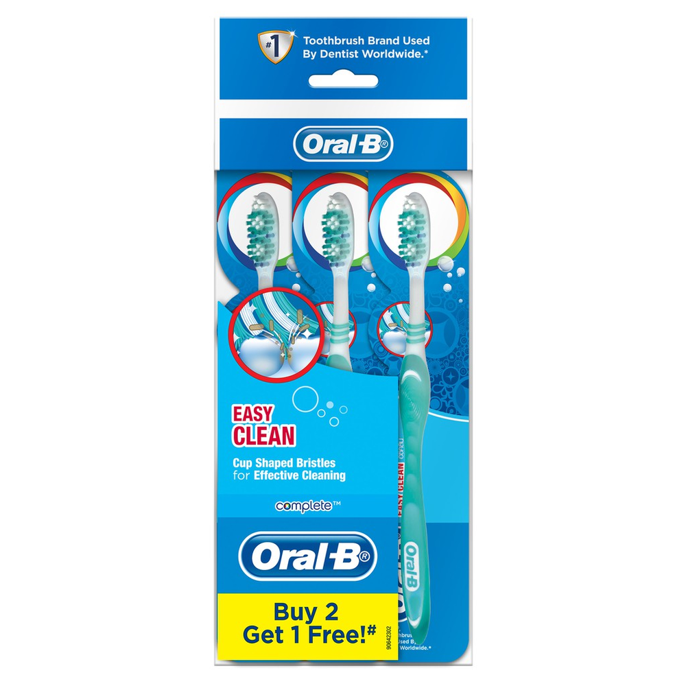 Oral-B Complete Easy Clean toothbrush, provides you with a three-way cleaning experience. It's cup-shaped bristles are designed to clean in-between teeth and along the gum line while its molded tongue cleaner is helps freshen breath. It also has end-rounded bristles which are soft on your gums.