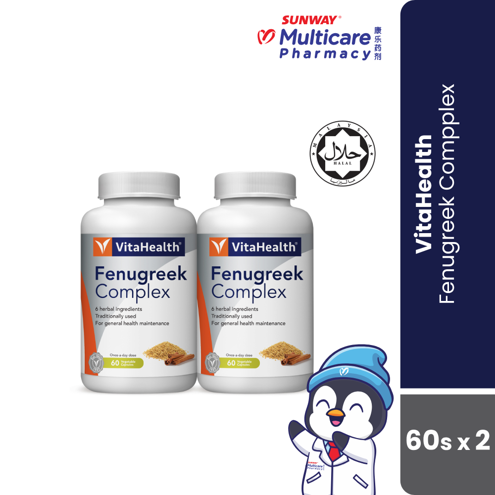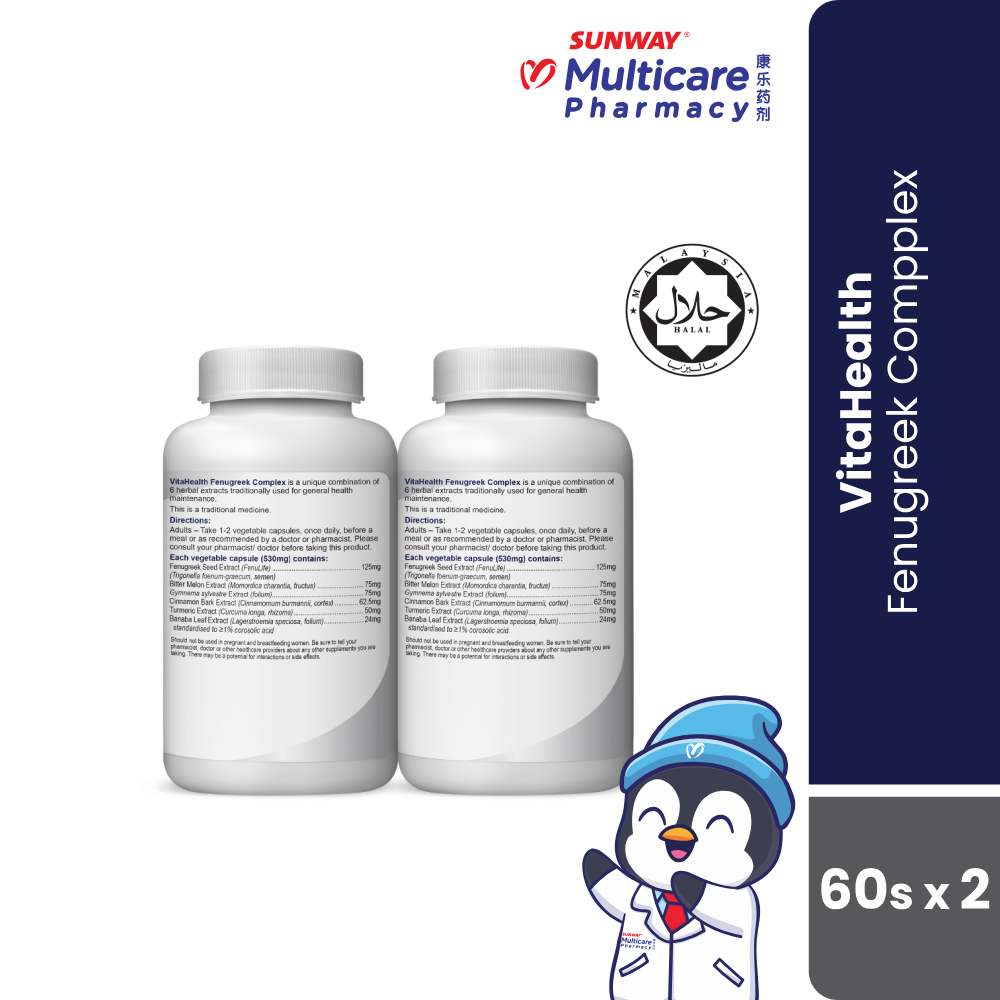 VitaHealth Fenugreek & Cinnamon Complex is formulated with a synergistic blend of fenugreek-seed extract, cinnamon-bark extract, bitter-melon extract and 3 other herbs to support healthy blood sugar levels. It helps maintain proper sugar balance and promote healthy cholesterol levels. It uses concentrated, odour-free fenugreek extract which contains 3 times more galactomannan soluble fiber than whole fenugreek seeds and will not leave a residual body odour. Banaba leaf extract improves the effectiveness of sugar utilization by the body cells. Turmeric extract provides anti-inflammatory effects and antioxidant protection that help fight against diabetic complications.