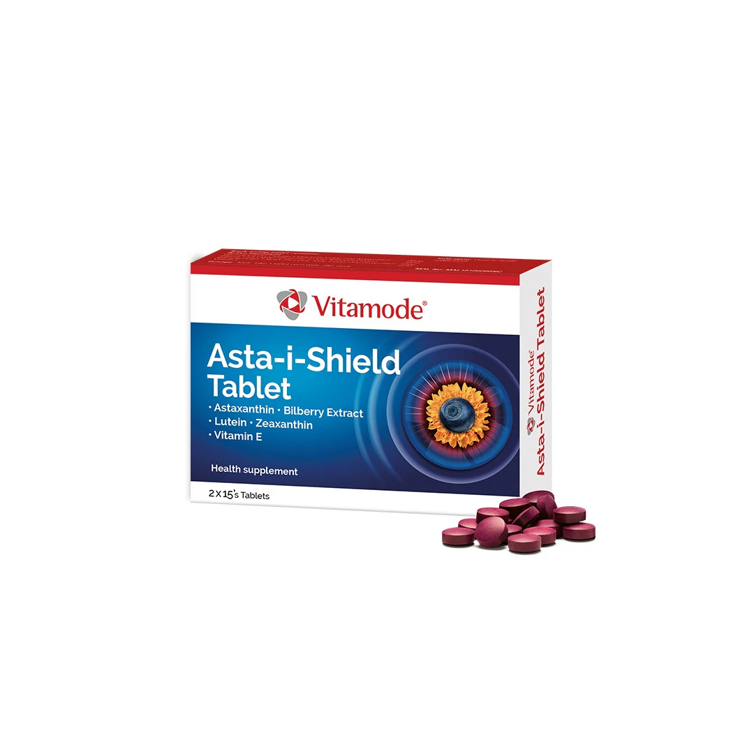 Vitamode® Asta-i-Shield Tabletcontains a complete profile of essential eye nutrients that includes AstaReal® Astaxanthin, Lutemax 2020® Lutein & Zeaxanthin, Bilberry and Vitamin E to protect against high-energy blue light and promote eye health.-energy blue light and promote eye health.