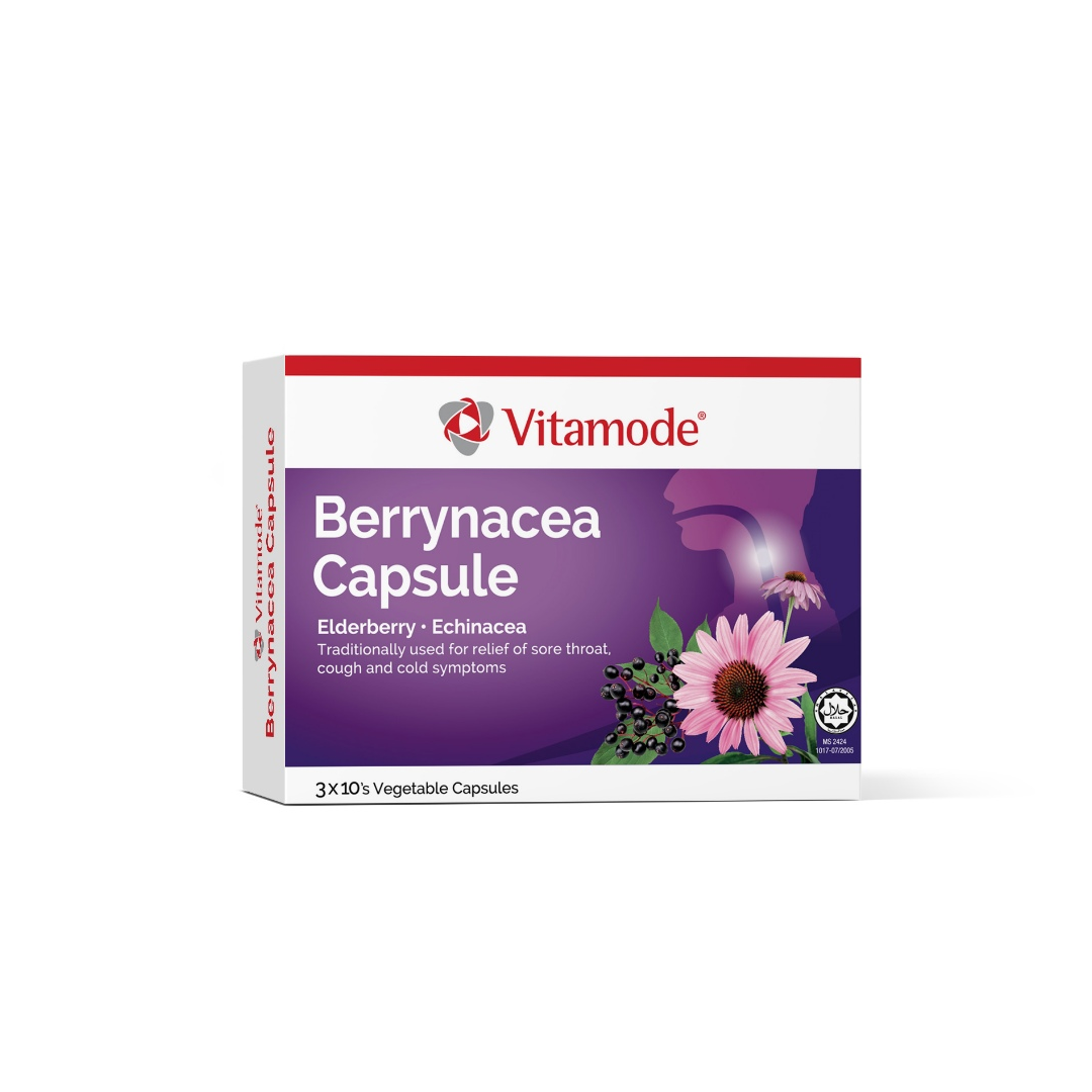 VitamodeรยฎBerrynacea Capsule is a combination of Polinaceaรยฎ Echinacea and BerryPharmaรยฎ Elderberry, both used to strengthen the body and combatsymptoms such as a sore or irritable throat and cough.