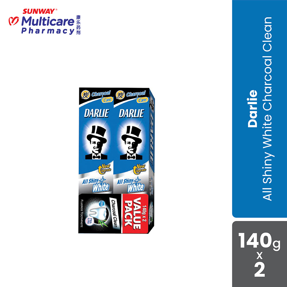 Darlie All Shiny White Charcoal Clean is powered by charcoal particles with natural absorption to thoroughly clean your mouth. Combined with Speedy Whitening Agent (SWA), the toothpaste delivers dual benefits of enhanced whitening and cleaning power.- Removes surface stains with SWA- Contains charcoal particles which clean your mouth thoroughly- Contains fluoride that fights cavities and protects teeth