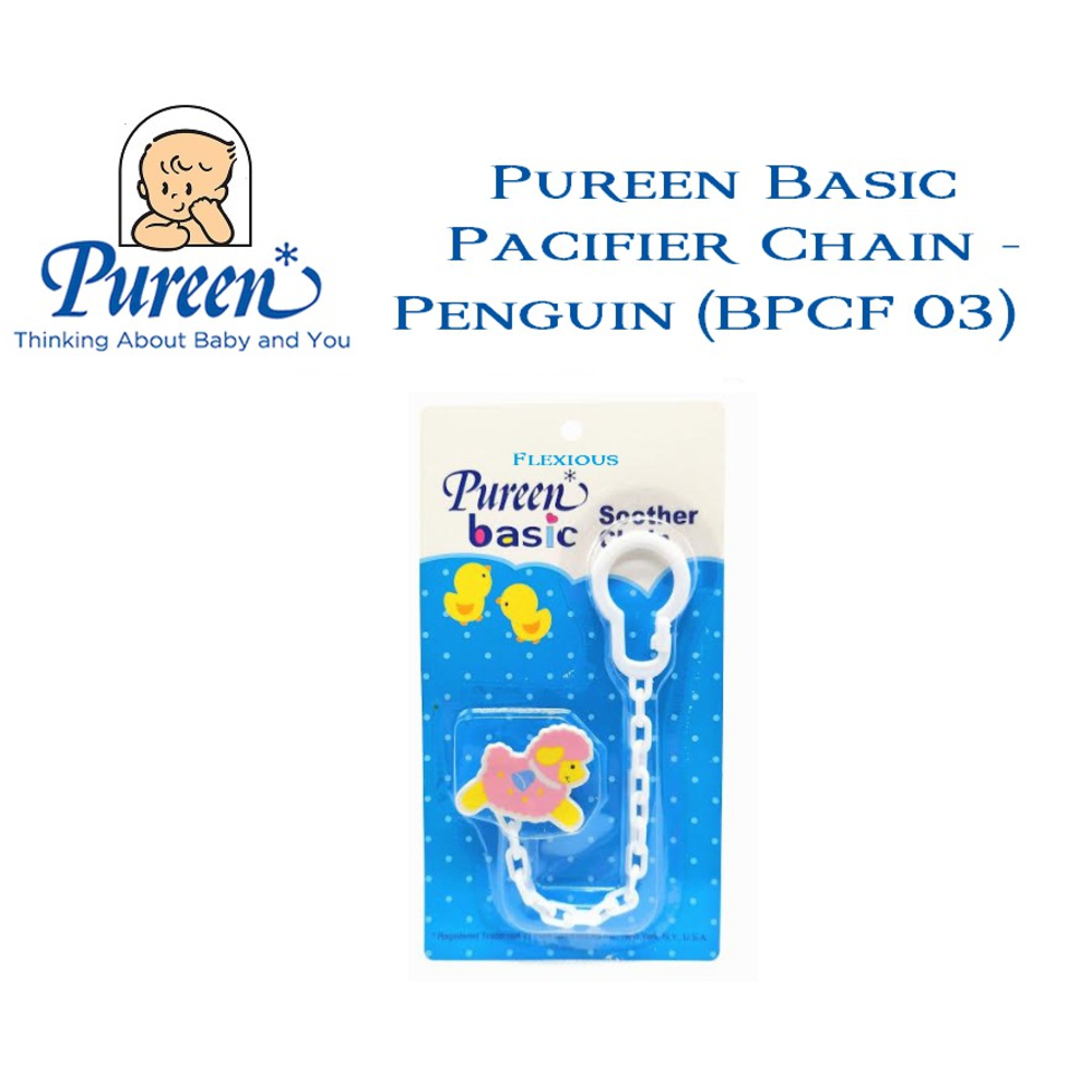 Pureen Pacifier Chain is made of high quality non-toxic materials. It is safe and hygiene for use on babies, comes with colourful badge clip. The pin safety latch prevents the infant from accidentally releasing it and hurting himself. It is also available in attractive animal designs.